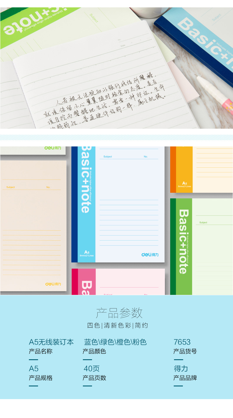 得力7654辦公無線裝訂本(混)-80張-A5*6