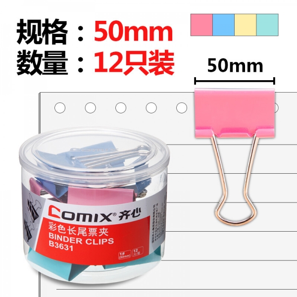 齊心B3631彩色長尾票夾51mm*12只/筒*12
