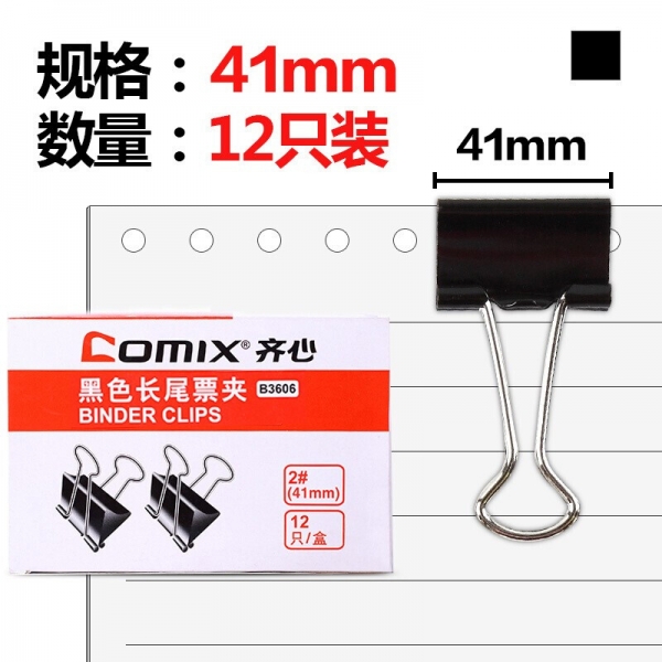 齊心B3606黑色長尾票夾41mm*12只/盒*12