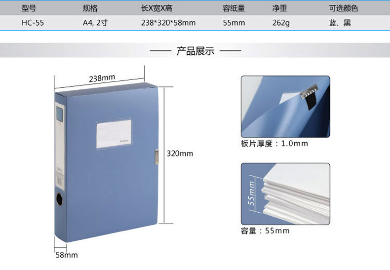 齊心A1249超省錢PP檔案盒A4 55mm藍*18