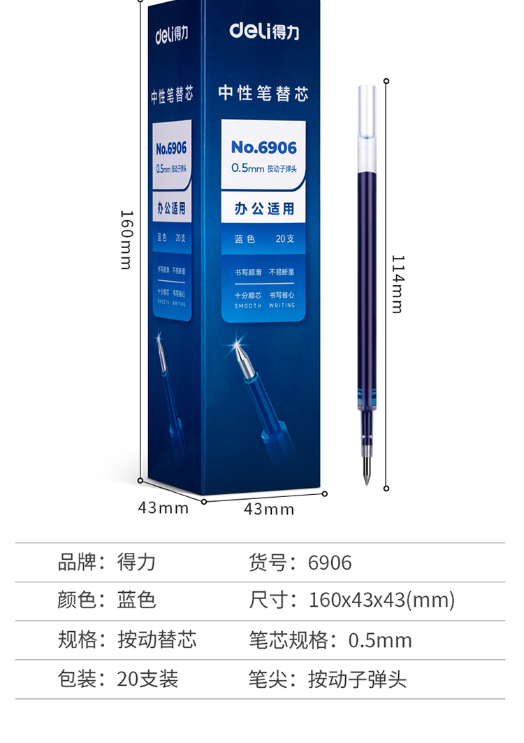 得力6906按鍵式中性筆替芯0.5mm藍色*20支