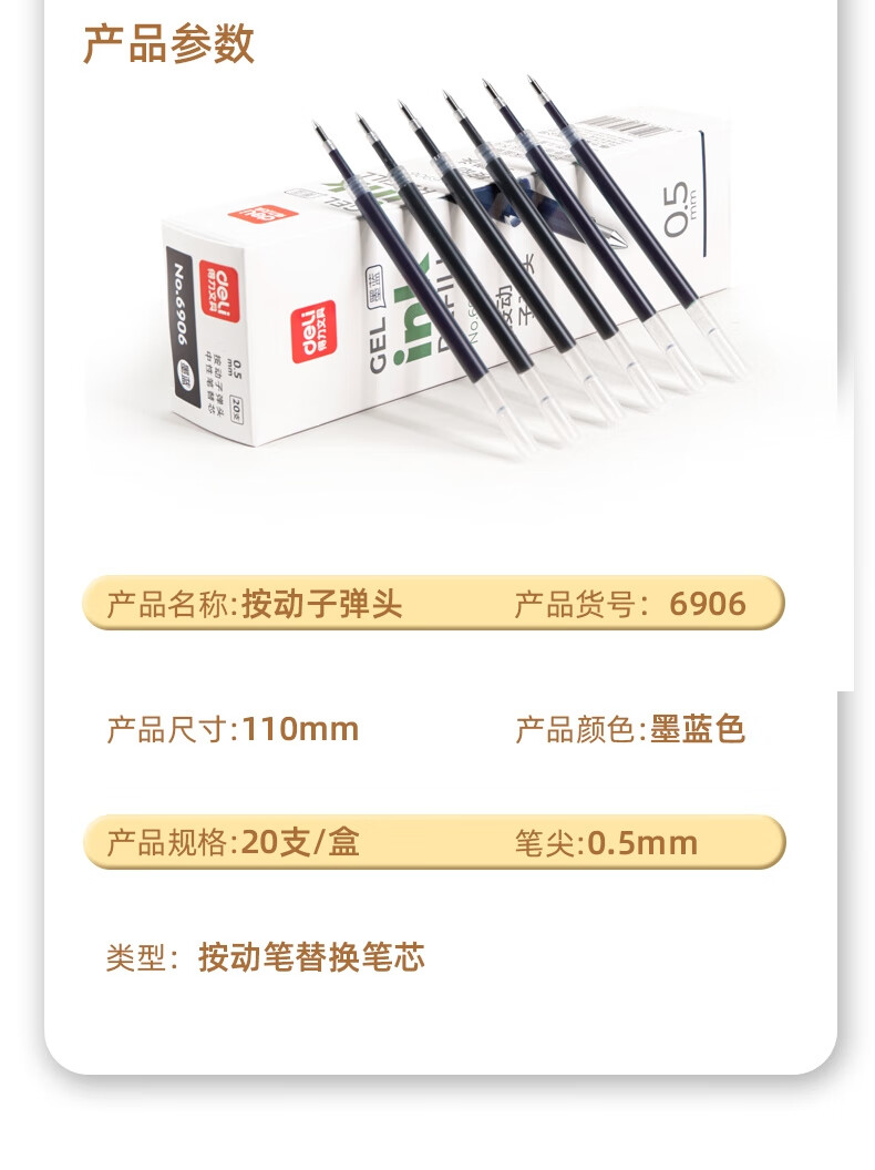 得力6906按鍵式中性筆替芯0.5mm藍色*20支