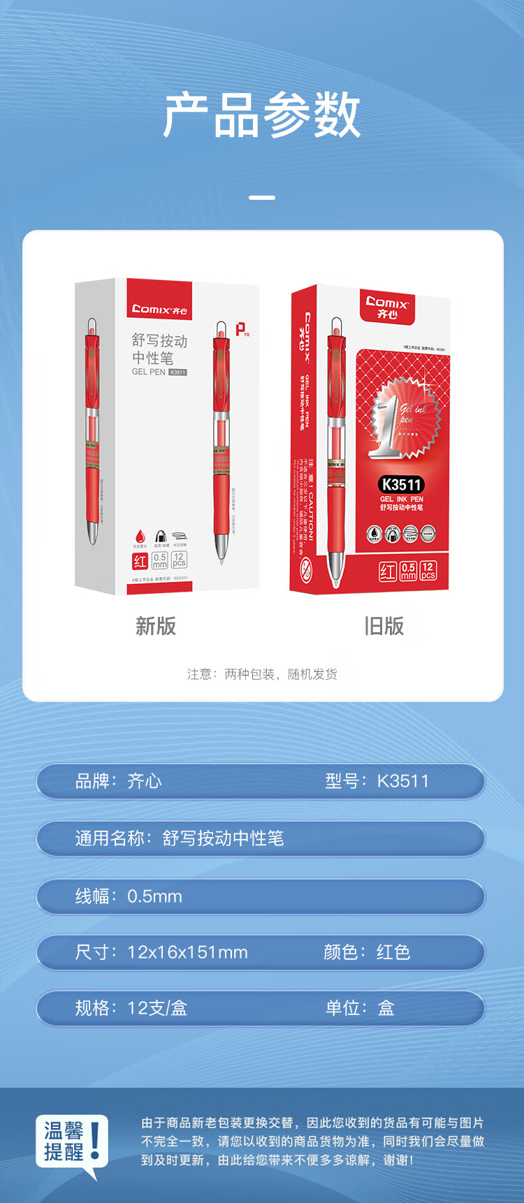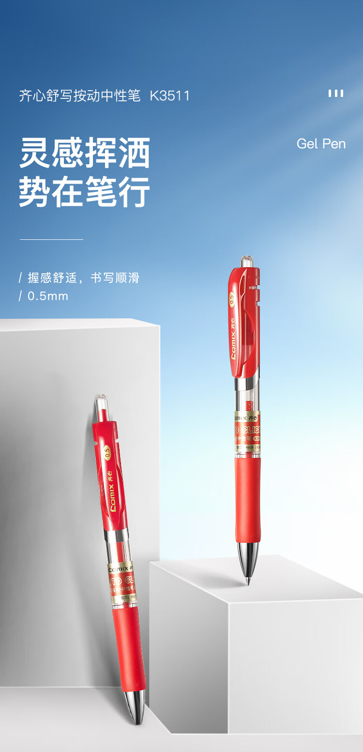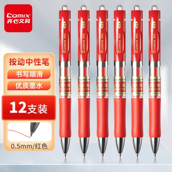 齊心K3511舒適按動中性筆0.5mm紅*12