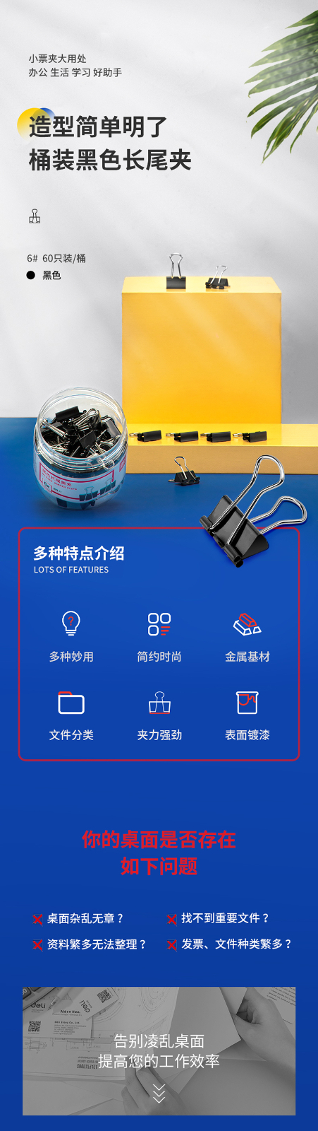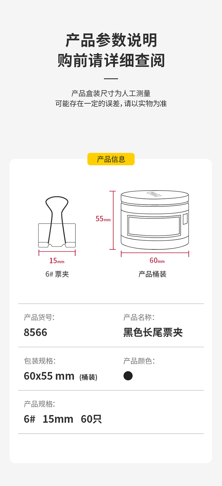 得力8566-6#黑色長尾票夾筒裝15mm*60只/筒