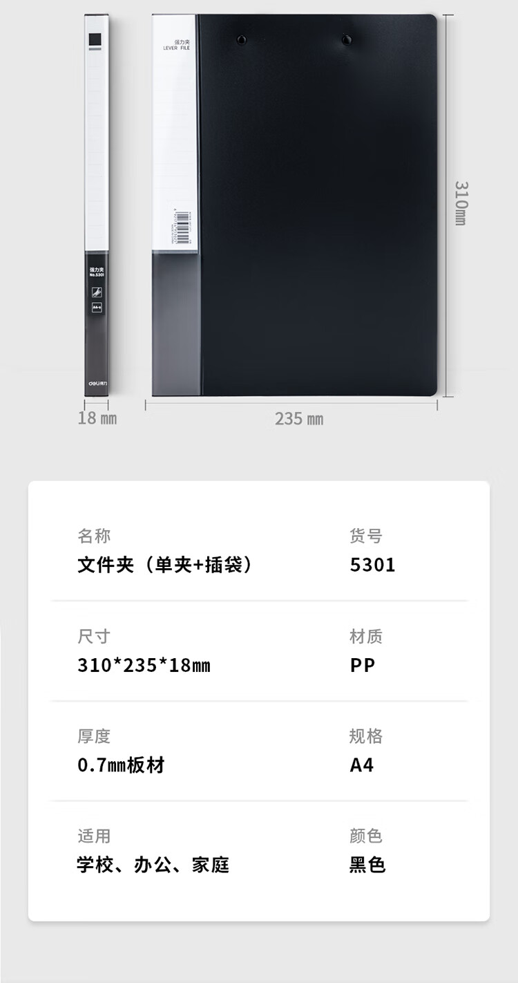 得力5301單強力夾加插袋(黑)*12