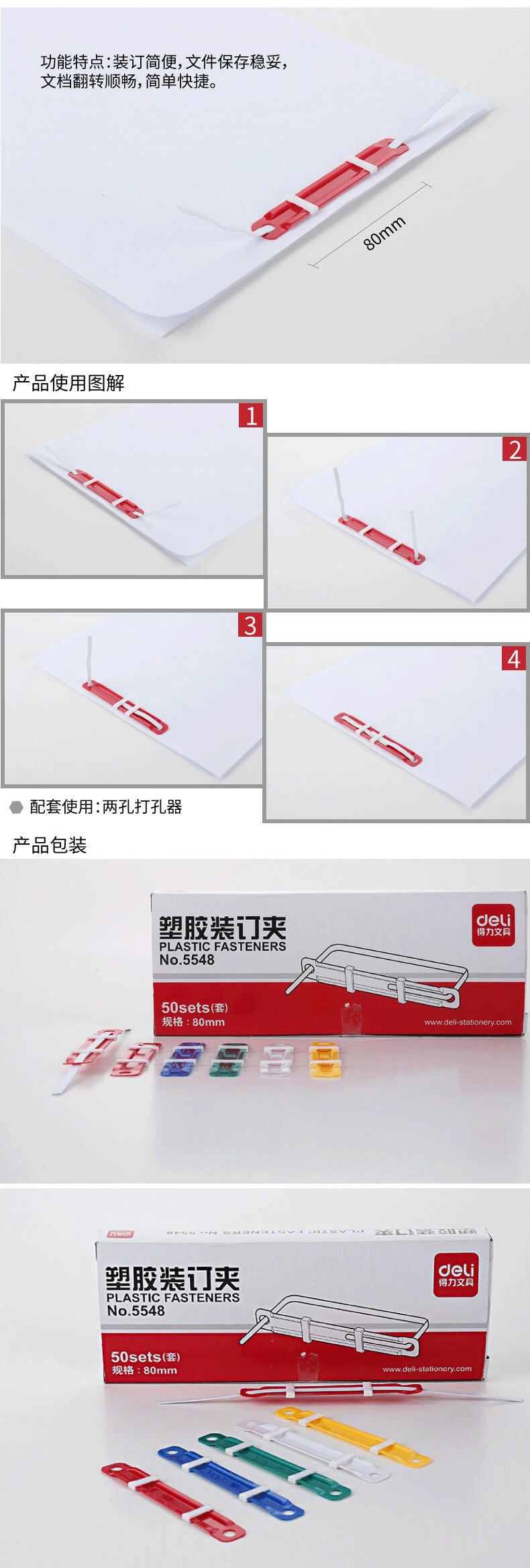 得力5548塑膠裝訂夾80MM(混)(50套/盒)
