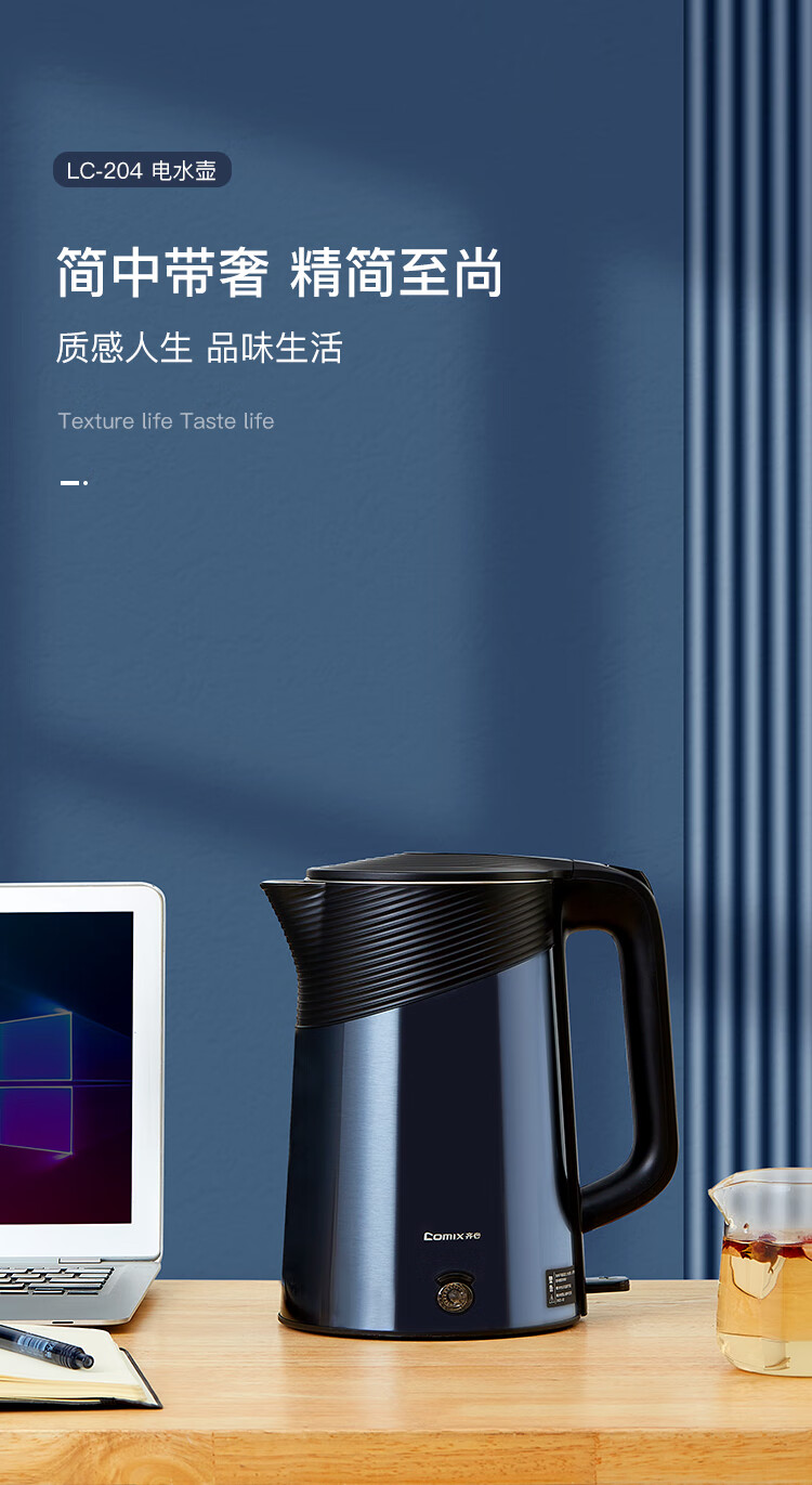 齊心LC-204雙層全鋼防燙電熱水壺 藍色 1.7L