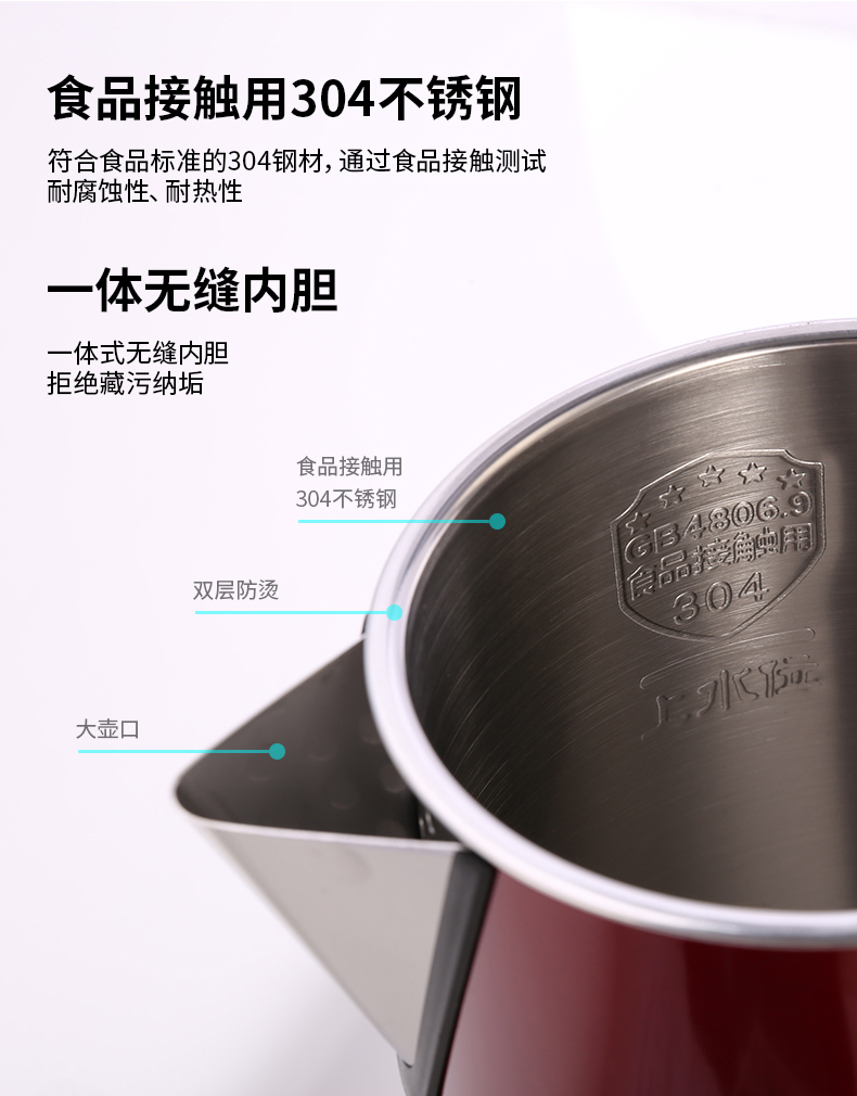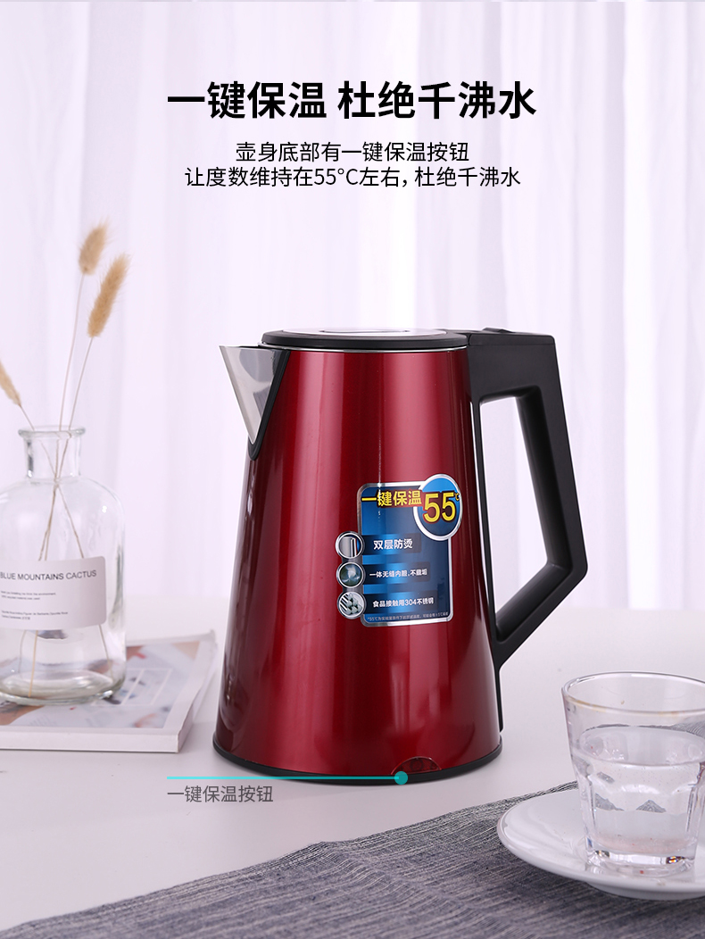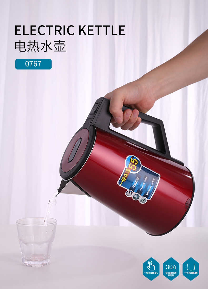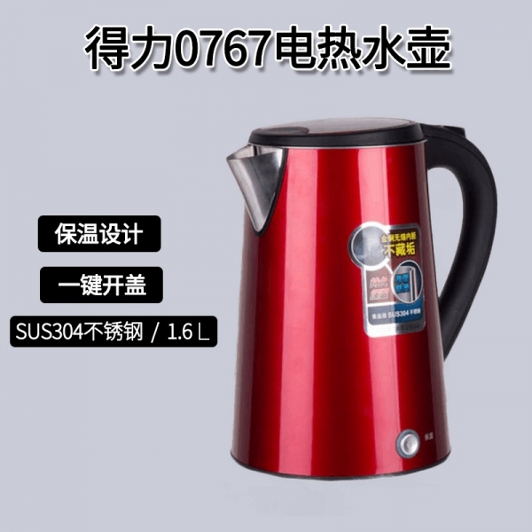 得力0767電熱水壺(紅)雙層不銹鋼1.7L