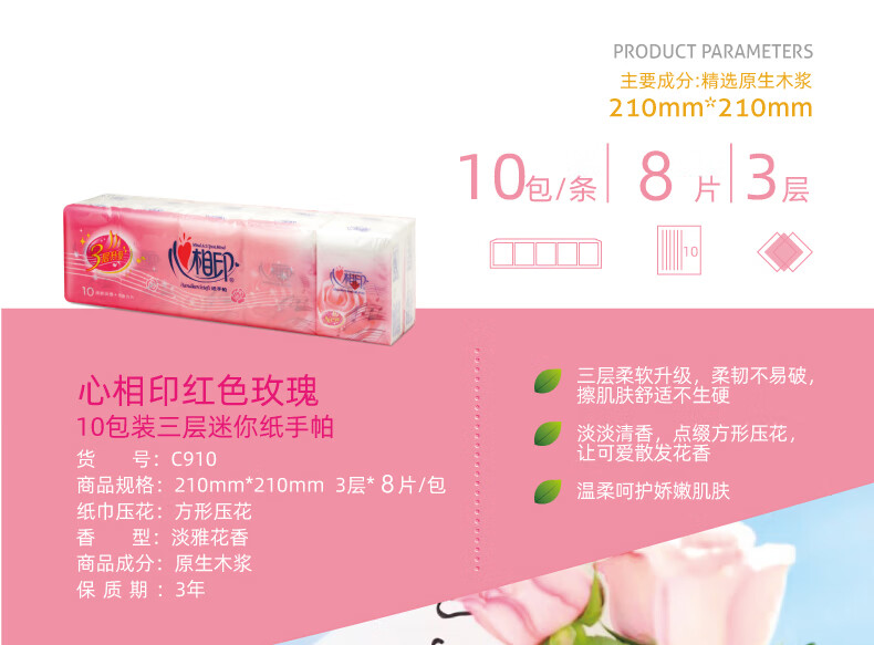 心相印C910三層無香手帕紙21*21cm(10包/條)