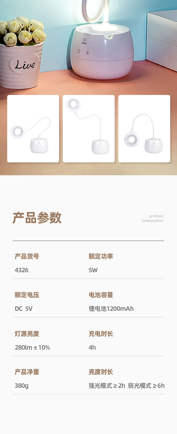 得力4326_LED筆筒臺燈(白)
