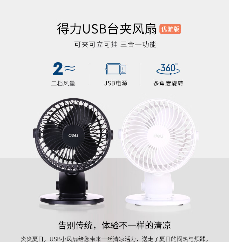 得力3688USB臺(tái)夾風(fēng)扇(白)(1臺(tái)/彩盒)5寸,兩檔,塑料USB直供電