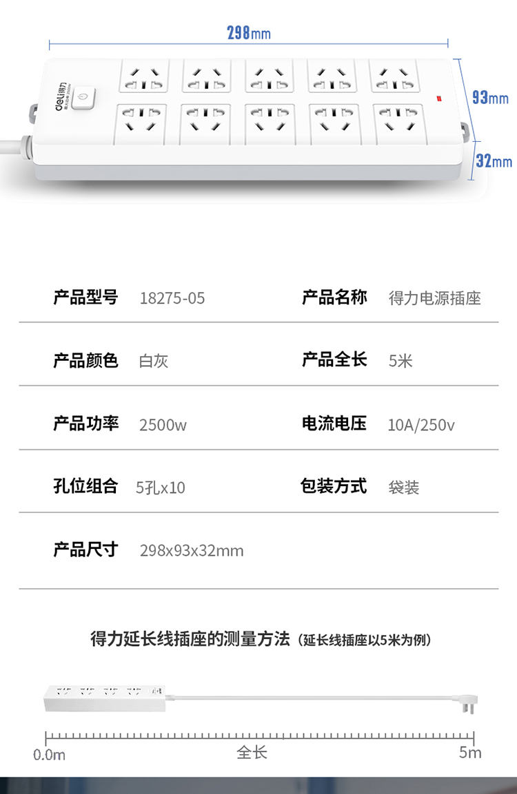 得力18275-05插座_10組_5米_PVC袋裝(白)