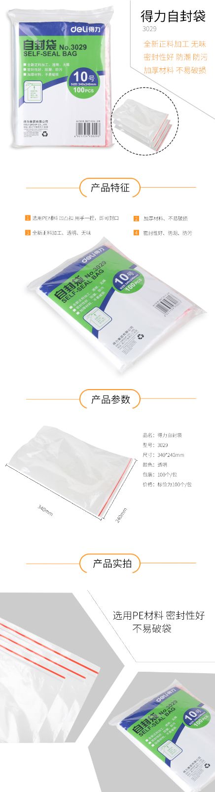 得力3029自封袋10號340*240mm*100pcs